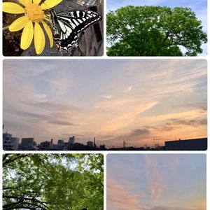 駅前の植え込みでアゲハが蜜を吸っていました😍 園芸店のシンボルツリーは若葉で爽やかでした🌳 夕焼けは環七の歩道橋からパチリ📱