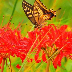 ヒガンバナ(彼岸花) アゲハ蝶が留まってくれました🦋 台風余波で風が強いですが、🦋さんも必至です🍀