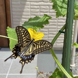 カメラを向けたら、アゲハ蝶がきゅうりの花にちょうどとまりました🍀🦋