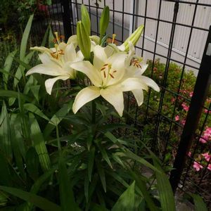 カサブランカのムカゴから咲いたユリが、狭いプランターから飛び出さんばかりの勢いで、満開になりました、ひっくり返らないように、足元をブロックで抑えています。でも、今日のような強風の時はとても危険で、はらはらします。