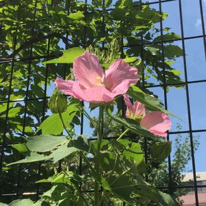 🌸 フヨウ(芙蓉) アオイ科 フヨウ属 葉は互生し表面に白色の短毛を有し掌状に浅く3~7裂する ピンクや白の花をつける。花弁は5枚で回施し椀状に広がる 先端で円筒状に散開する雄しべは根元では筒状に癒合しておりその中心部から雌しべが延び雄しべの先よりもさらに突き出して5裂しているそうです
