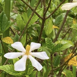 一重の梔子の花🌼 一重には実が付き、おせち料理の栗きんとんの色付けに使います🍱 着物👘を包んだり、本や木箱を包むクチナシ染めの風呂敷にも使われている物を見ます。 身近に結構ありますよね〜 虫除けになると聞いていますが、、 🍋🌱🍋