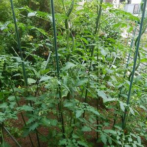 雨があがったので、夕方庭を一回り! ミニトマトは自己流5本仕立てで、中心の枝と共にそれぞれ背くらべしながら順調に伸びています🍅