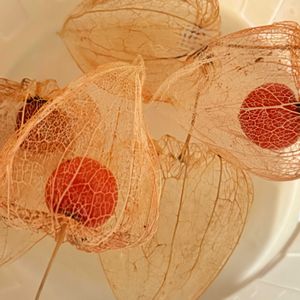 透かしホオズキを使ってみました お水に浸して置くだけで本当に出来るのですね🫥🫥🫥🫥🫥🎶 5つのうち2つだけ実も綺麗に残せました🟠🟠🎶🎶