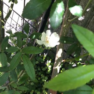 🏷️今日のお花…🥀白木香薔薇ピューレッツア。 真っ直ぐにスクスクと伸びて…夏場は笹の葉が揺れているかのような和風な雰囲気にもなりますが…ハーフアーチを使えばお洒落なイメージにも…💓 可憐な白の小さなお花で…なかなか強くて勝手に育つつるバラです(笑) 年に1回5月頃にしか咲かないのが残念ですが…ベランダが華やかになります╰(*´︶`*)╯♡