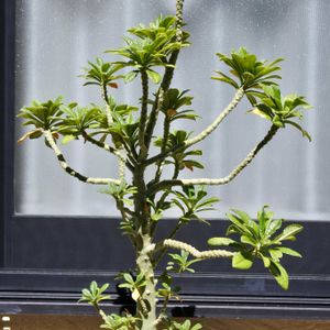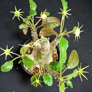 ドルステニア フォエチダ 去年の初冬に購入してすぐに葉を落とし、春に新芽が出てから植え替えしないとなーと思いながら室内管理で放置してしまい、あまり調子は上がらず花を付けません。 今日ようやく植え替えしました。