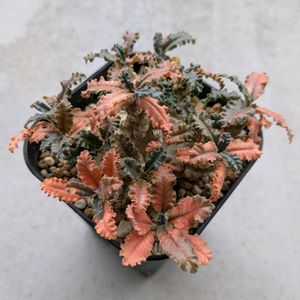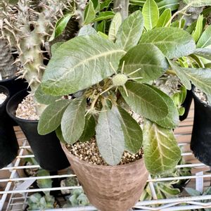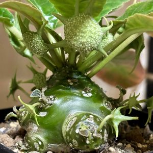 ドルステニア フォエチダ 植え替えをして屋外管理に変えたフォエチダ。 葉っぱがシャキっと伸びて新芽と花芽を噴いて調子が上がってきました。