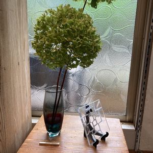 アナベル(アメリカアジサイ) 窓辺に置いてみました 昨夜の雷雨で折れてしまったのでお家の中に来ました。