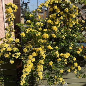 1週間前の良いお天気の日、咲き始めたモッコウバラです。 実はこの花は大好きだけど、誘引が苦手で、どうしたらいいかわからないくらい伸びて、手に負えてません😂
