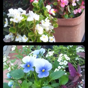 北側門扉のそば 上💗越冬準備に寄せ固めたベゴニアの鉢が まだ綺麗なので置いてあります! 下💗ガーデンランプの足元に植えたビオラ。 夜中点灯してるので 暗くなる時がないけど どうなる?