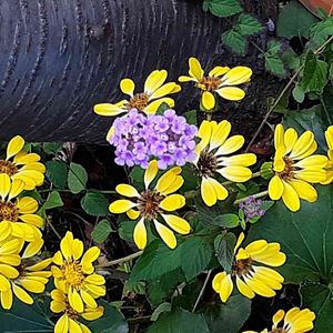 おはようございます🌸 石蕗の花の中の紫のランタナ 頑張ってますね😄