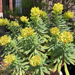 ユーホルビア バローイエロー 昨年迎えた苗が大きくなりました。 この鉢植え🪴を見ると 次男が彼女の家に結婚の承諾の挨拶に行き 我が家に連れて来た時に愛車をぶつけて 割ったことを思い出します(笑) 幸い新車は傷付かなかったけど お気に入りの鉢だったのでワイヤーで 縛って使っています😅