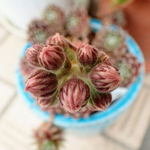 センペルビウム・赤巻絹のつぼみです。開花したら枯れてしまうけれど、周りに沢山子株が出来ているからだいじょうぶ~(*^▽^*)~(多分)😅💦