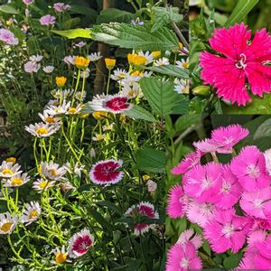 今日のお花ꕤ*.゚ ビジョナデシコ 5月の庭より 右下のピンクのがとってもいい香り💓背がどんどん高くなって咲いてくれたので膝伸ばしたままでꔛ♡これが美女ナデシコかなぁ✿ 香りよ〜届け〜💖✨