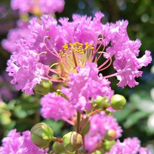 こんにちは🔆 毎日 暑い日が続いてますが この暑い日を待ち望んで 三ヶ月以上咲き続ける花 その名も 百日紅🪷 爽やかグリーンの蕾はコロコロとして その中にギュッと凝縮された花が詰まっている その一つが弾けて 大輪の花の様に華やかで 波打つ様なフリフリの花弁 真ん中の黄色い蕊が太陽の陽を浴びて輝き 正に大輪の花火が塊になって咲き誇る 枝の先に重たそうにたわわに咲き 青空に向かって優雅に揺れる 木の幹はすべすべして 🐒も滑って登れないとか? 秋まで優雅に咲き誇る 夏を代表する花 別名 サルスベリ🌳