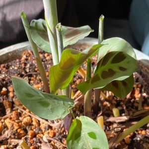 来た〜〜〜!! 念願の斑入りの葉です💓 斑入りと言っても葉脈が目立っているだけですが、他の緑の葉とは全然違う!! 連れ帰った時はもっと斑入りもあったのですが、光量が足りないのか、最近緑の葉だらけだったので、これはテンション爆上がり⤴️⤴️⤴️ それにしても、この曲線の綺麗なこと✨✨自然の成せる技ですね💓