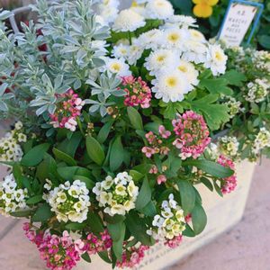 おはようございます😊 1月頃に寄せた スカビオサ 白ときどき桃 ヒナソウ アリッサム シレネユニフローラ の寄せ植えです😊 スカビオサは、咲き始めは白で最終的にピンクになっています😊 シレネユニフローラは、咲き始めました😊 今日も素敵な一日をお過ごしくださいね〜😊