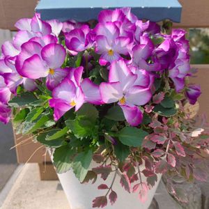 おはようございます😊 久しぶりのビオラさん♡ セリとの寄せ植えなんですが、モリモリになりすぎて、鉢から出そうです😆 今日は太陽☀️出ましたが、明日からまたしばらく雨模様です😅 今日も素敵な1日をお過ごしください💖