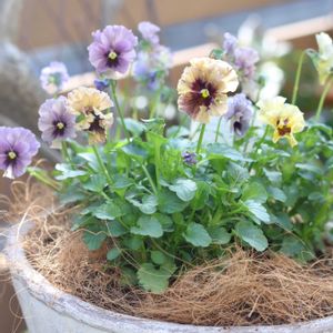 ときめきビオラシフォンドレスの寄せ植え☺️ 優しいイエローに少しピンクのようなグレー🩶のような色が入るのが好きです☺️