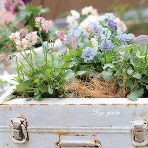 うえたさんのアンジュフルールの寄せ植えなど☺️ 斑入りワイヤープランツにロータスコットンキャンディが入っています☺️ 左は、ビオレッタの寄せ植え☺️ 2株植えていつ、1株もりもりなのに、もう1株は咲いてないです😂 後ろは、ストックの寄せ植えとブーツは、ファルファリアが入っています☺️ 今日も寒いですね〜💦 暖かくしてお過ごしくださいね🍀