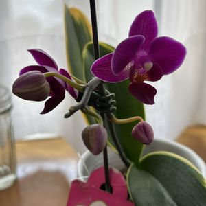 斑入り葉のミニ胡蝶蘭💕 ダイニングの出窓にずーっと置いていて毎年何とか咲いてます😅 お友達からの頂き物です。🤭