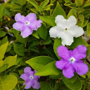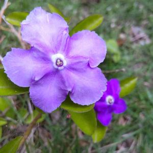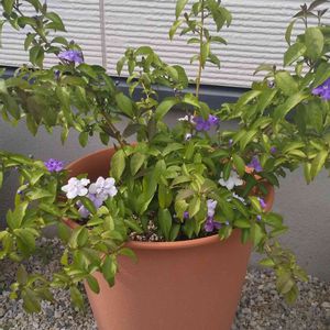 ニオイバンマツリ(香り茉莉花) 久し振りにジャスミンの香りの バンマツリを わが家に迎えました。 💜💚💜ハート型です。 昼間は庭や玄関外に出して観葉植物と一緒に歩く☀陽にあてます🌿🌿🌿
