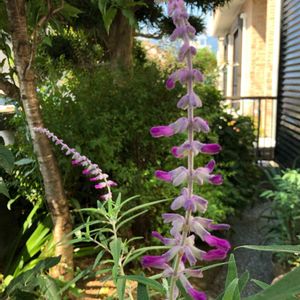 お庭ではアメジストセージのお花が咲き始めました🌸 大きな鉢に植えてあるので、あちこち別々の方向に咲いてます😄