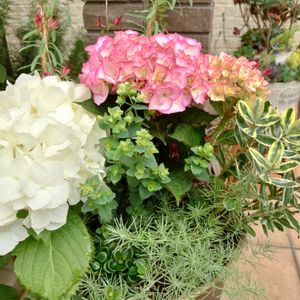 あじさい寄植え 白とピンクのあじさいは 初めてです。 来年もピンク色にするのは 難しい?