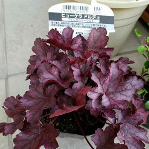 以前から欲しかったヒューケラドルチェのチョコミント 398円(税込437円)、ホームセンターで購入。真っ赤でモリモリ繁ったチェリーコンポートにも惹かれたけどうちにはハルディンの赤いの(ファイヤーチーフかファイヤーアラーム)があるではないかと我慢した。でも欲しい。だって違う赤だもの~