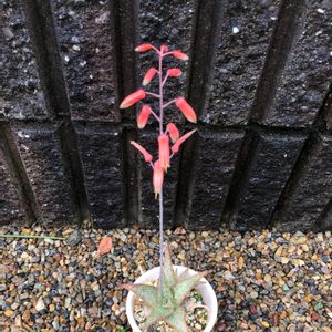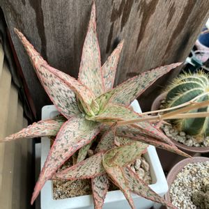 アロエ おそらくピンクブラッシュ 去年秋 札落ちボロボロの投げ売り株だったヤツを見かねて購入 花も咲かせ だいぶ立派になった 冬になると紅葉します