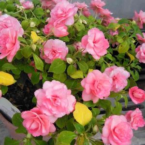 こんばんは😃🌃‼️ カリフォルニアローズ フィェスタ ピンク ラッフル 黄色い葉は目をつぶってね! 水切れか、日照不足?
