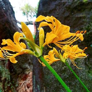 〜✿黄色彼岸花✿〜 鍾馗水仙ショウキズイセン やっと咲きだしました♡ 庭の奥にひっそりと♥ ずっと開くのを楽しみ😊に してたのですが 先越されて、じぃじに 1輪切られてました💦 えー😰 ま、玄関に飾ってくれてるからいいのだけれど… やっと咲いてくれて ありがとう🌼*・