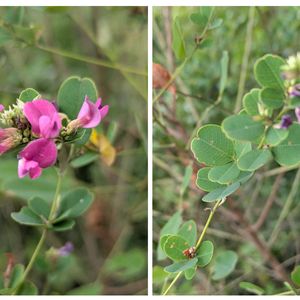 マルバハギ(丸葉萩) マメ科 ハギ属 別名 ミヤマハギ(深山萩) 本州から九州、朝鮮、中国に分布する落葉低木 山の尾根筋などに生育する 花期は8〜10月 葉は3出複葉で互生し、小葉は2~4cm 葉腋に短い総状花序を出し、赤紫色の花をつける 花序は基部の3出複葉より短い 小葉葉丸く、先がへこむ 3️⃣は2023年に咲いていたもので、花数が減ってきているように思います 枝はあまり枝垂れない方ですが、山の斜面に咲いているので垂れています
