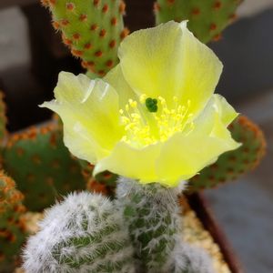 バニーカクタスのお花 𑁍︎·͜· 咲いてるぅ〜♪ 透き通った黄色い花びらがとっても綺麗で可愛い ✼* ⸜(⑅´ᗜ`⑅)⸝バニーꕤ*。゚