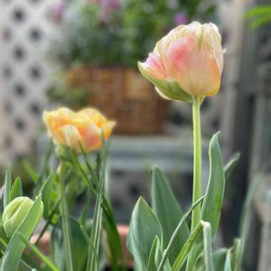 おはようございます チューリップ “アンジェリケ” 2番目の花が咲きました。 今度はオレンジより💛 咲き進むと変わるのでしょうが、同じ色の球根じゃないみたいです。