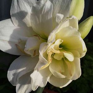 白のアマリリ 昨年は花茎が上がらず 今年初めてお花を見る事が出来ました 朝陽を浴びて 綺麗🥰 これから、徐々に開き 豪華になるのが楽しみ~💞