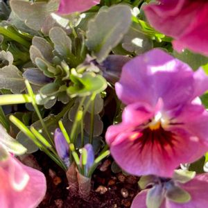 おはようございます “クロッカス ブルーパール” こちらも花びらの色が見えてきました ビオラに囲まれてる小ちゃい子です (*☻-☻*)💙