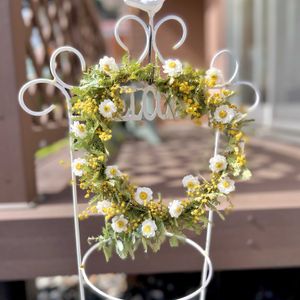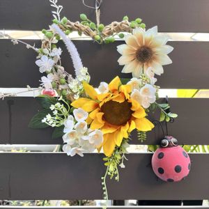 ヒマワリのリース♡ 暑くても外でがんばってくれる 造花を使って作りました♪ 猛暑のせいで 早朝しか庭仕事ができない日が続く 今年の夏です 〜(>人<;)〜