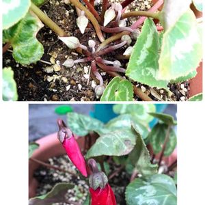 グリーン達にお水をあげてたら 鬱蒼としたシクラメンの森から何やら赤いモノが😳‼️ 掻き分けると中からシクラメンの蕾が出てきたーーー😃✨ バルコニーでほとんど放置だったシクラメン😅💦 お花は諦めていただけに、一気にテンション⤴️⤴️✨ どの株にも蕾が付いてて嬉し過ぎる😆💕✨ 慌てて傷んでる葉をもいで整えてみました。 「現金やな、しかし‼️」(やすきよ、やすし師匠風に) と、シクラメンからツッコミ入れられそうです😝