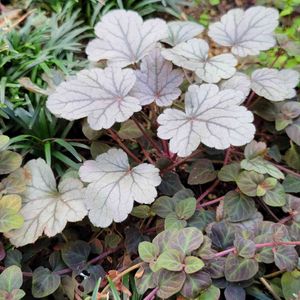 今日のお花はヒューケラですね𓂃𓈒𓏸୨୧*.゚ 我が家の日陰花壇で大活躍のカラーリーフです(´˘`*) 花壇の奥行きのあるところは手入れが大変なので、鉢植えにして置いています(ヒューケラ、ティアレラ、アスチルベ、コロキアなど) …𖡼.𖤣𖥧𖡼.𖤣𖥧⚘……… ꕤ PWヒューケラドルチェシルバーガムドロップ ꕤ ティアレラピンクスカイロケット