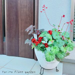 玄関前の一鉢 カラー数を出来るだけ抑え 統一感を出しました ヒューケラの赤い花茎が一本 生け花のように伸びて 趣があって.。*✨ こういう自然美が好き ( ꈍᴗꈍ)ฅฅ♡