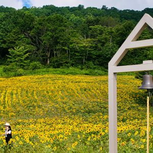 ♡ヒマワリ③♡福島喜多方市三ノ倉高原 春には一面の菜の花だったスキー場ゲレンデ。今8ヘクタールに約250万本のヒマワリ🌻。 天まで続いていそうな🌻。 眼下には会津盆地。この日の会津地方の最高気温37°、今日は38°の予報。 さすがに標高600メートルのゲレンデも暑く🥵駐車場付近だけで即🚗に避難😅