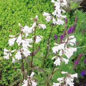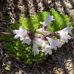 ペンステモン ハスカーレッドが咲いています。 昨秋お迎えして無事越冬、ぐんぐん伸びて、 1㍍くらいに育ちました。 雨が降っても倒れない丈夫さが頼もしいです。 寒いときは赤みがかった銅葉でしたが、 最近は紫がかった上に緑みも増した色になり、 (金時草に似て美味しそうと思ったりも…笑) じっくり眺めています。 花がまた良い色合いで、 白い花が付け根に向かって 紫のグラデーションになっているのが素敵です。 しべが中でくるんとしていてゴージャス… なのですが… この黒いしべが目に見えてしまうと一転、 ちょっと困ってるかわいい顔がたくさん並ぶ、 ユーモラスな雰囲気も楽しめます。 秋の計画では、 隣にリシマキア ボジョレーも咲いて 白黒反転ペアを楽しむはずだったのです。 が、 早春のある日、ボジョレーさんがポロっと 地面から転げるように外れまして、唖然呆然。 見ると根っこが殆どなくなっていました。 株元からか地中からか、食べに入られた様でした。 そんなわけで、悲喜こもごもの開花を迎えまして、 しっかりお花を堪能しようと思っています。