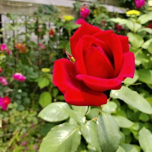①新たに赤いバラが咲き出しました。 バラらしいバラ🌷 ②ペンステモンとオルレアが一緒に咲いてます。 ③春にオルレアがしか芽吹かないので、試しに一株購入したブラックレースフラワー。高さ120センチになりました。自立してるのが立派!