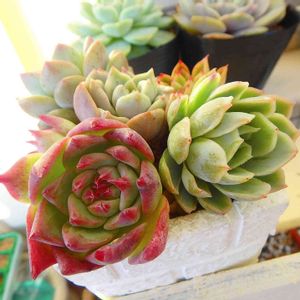 プレゼントしてもらった 斑入りグリネとラウリンゼ 早速寄せ植えしましたよ(*-∀-*)ゞエヘヘ 昨日お迎えした多肉と共にね❣️ 贅沢な鉢になりました✨