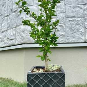 ムクゲ モーニングサンシャイン🌸 新しい鉢に移し替え…(๑ơ ₃ ơ) 根元にシレネ を乗せてみました。