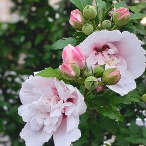 おはようございます🤗 今日のお花🍀ムクゲ 白っぽく見えますが、薄い紫色です。 鉢植えなので丈が低いです😊