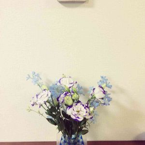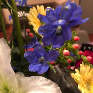 お出かけ先から帰ってきた主人が買ってきた切り花(╹◡╹) カーネーションとこのブルーのお花なんて言うんだろうねえ〜〜🤗💞