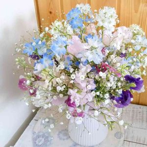 花束、束ねました😊 デルフィニウム スイートピー かすみ草 総額550円😆 淡い色あいが好みです💓