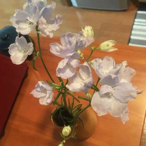 桃とデルフィニュウムを合わせてみました。デルフィニウムの花びらがうっすらピンク色です(╹◡╹)